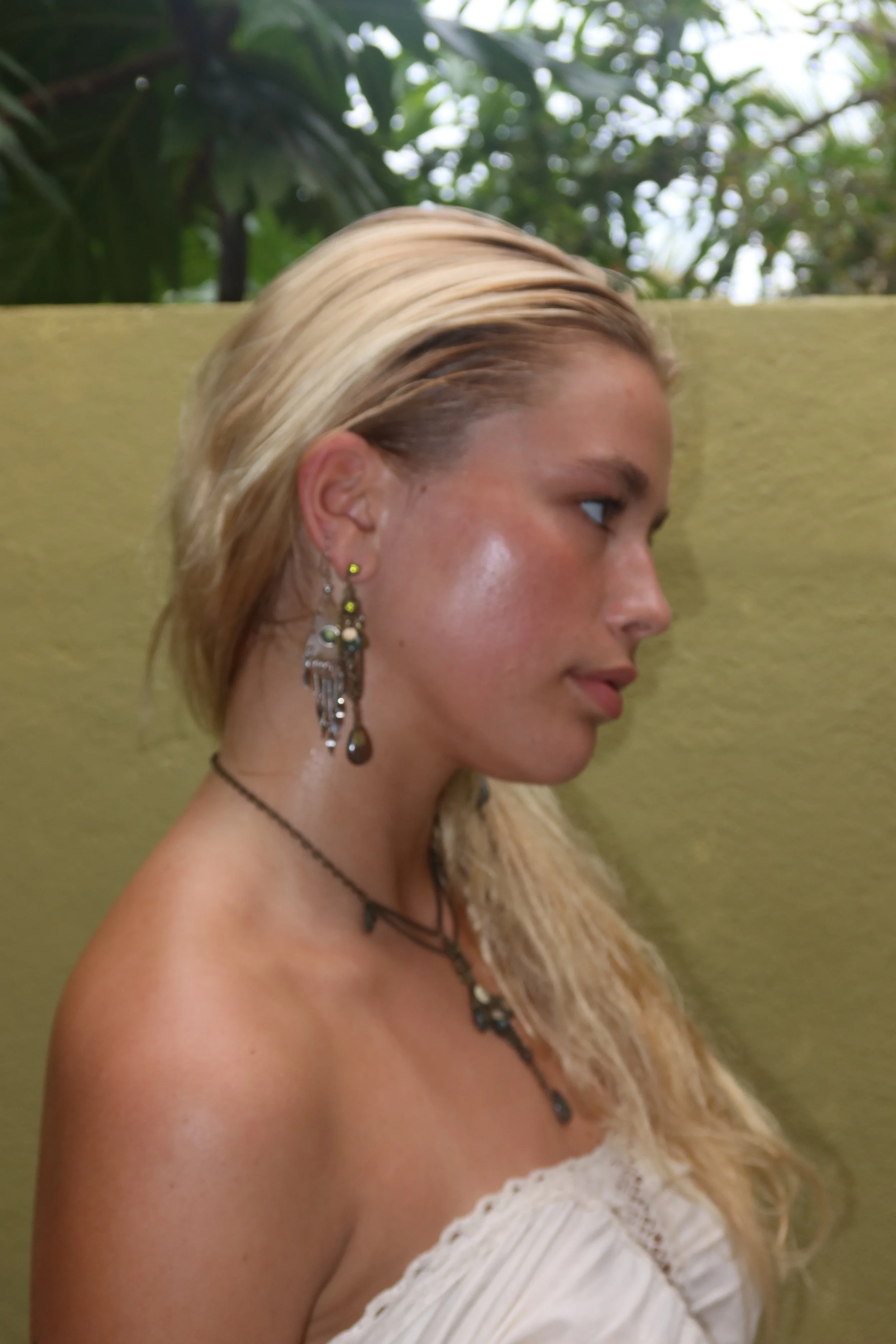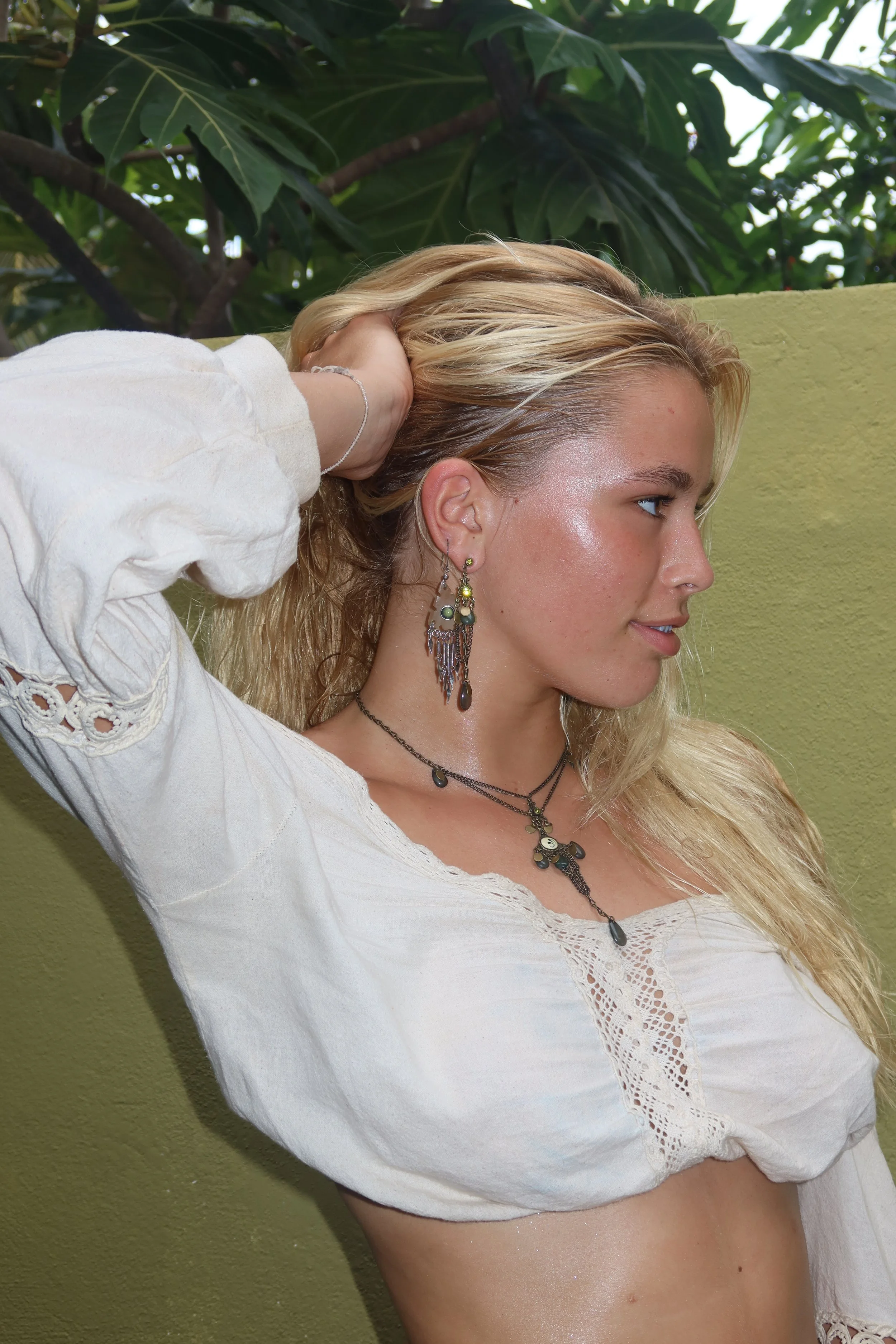 The Fortuna Drape Chain Earrings are a core of this collection. Beautifully draped drop chain earrings with intricate brass details and coloured gems.