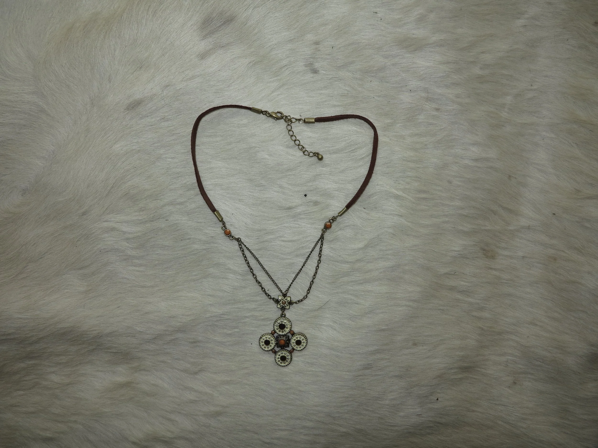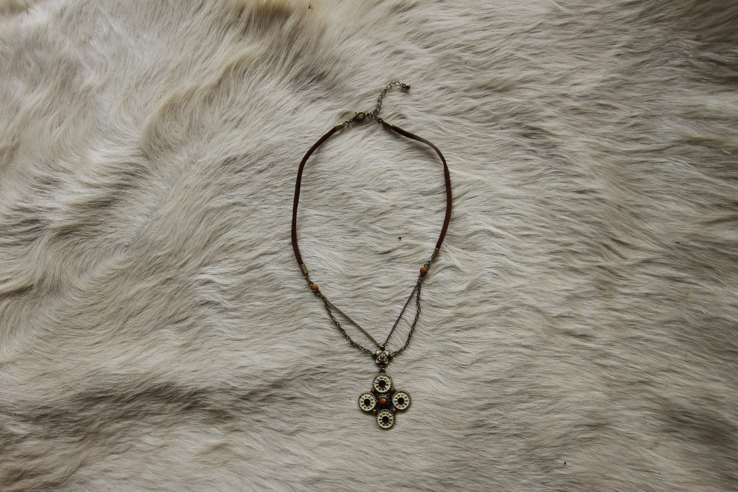 The Quadra Field Double Chain Necklace is a grounded vintage piece crafted on a brass chain featuring a warm cream toned double quadra pendant with small orange details, attached to double brass chains and brown suede leading to an adjustable clasp.
