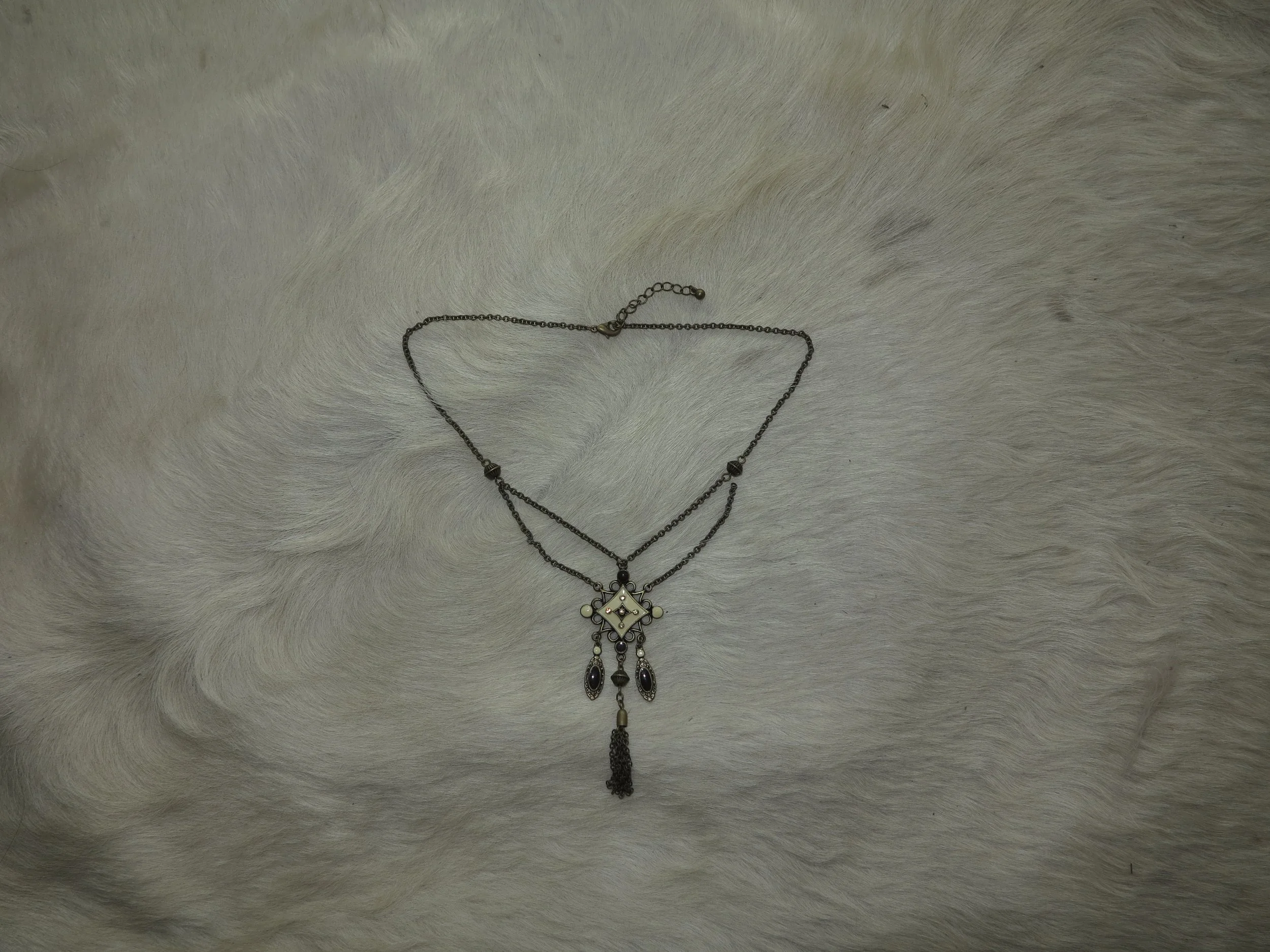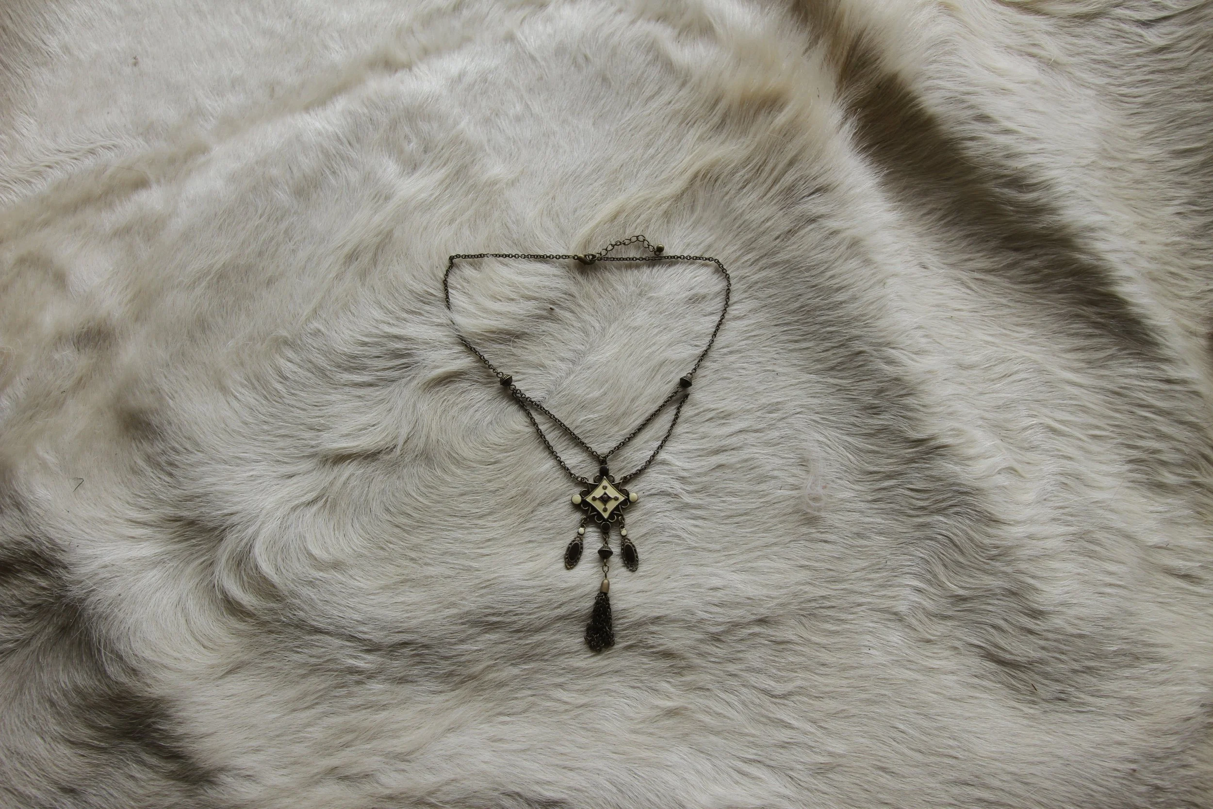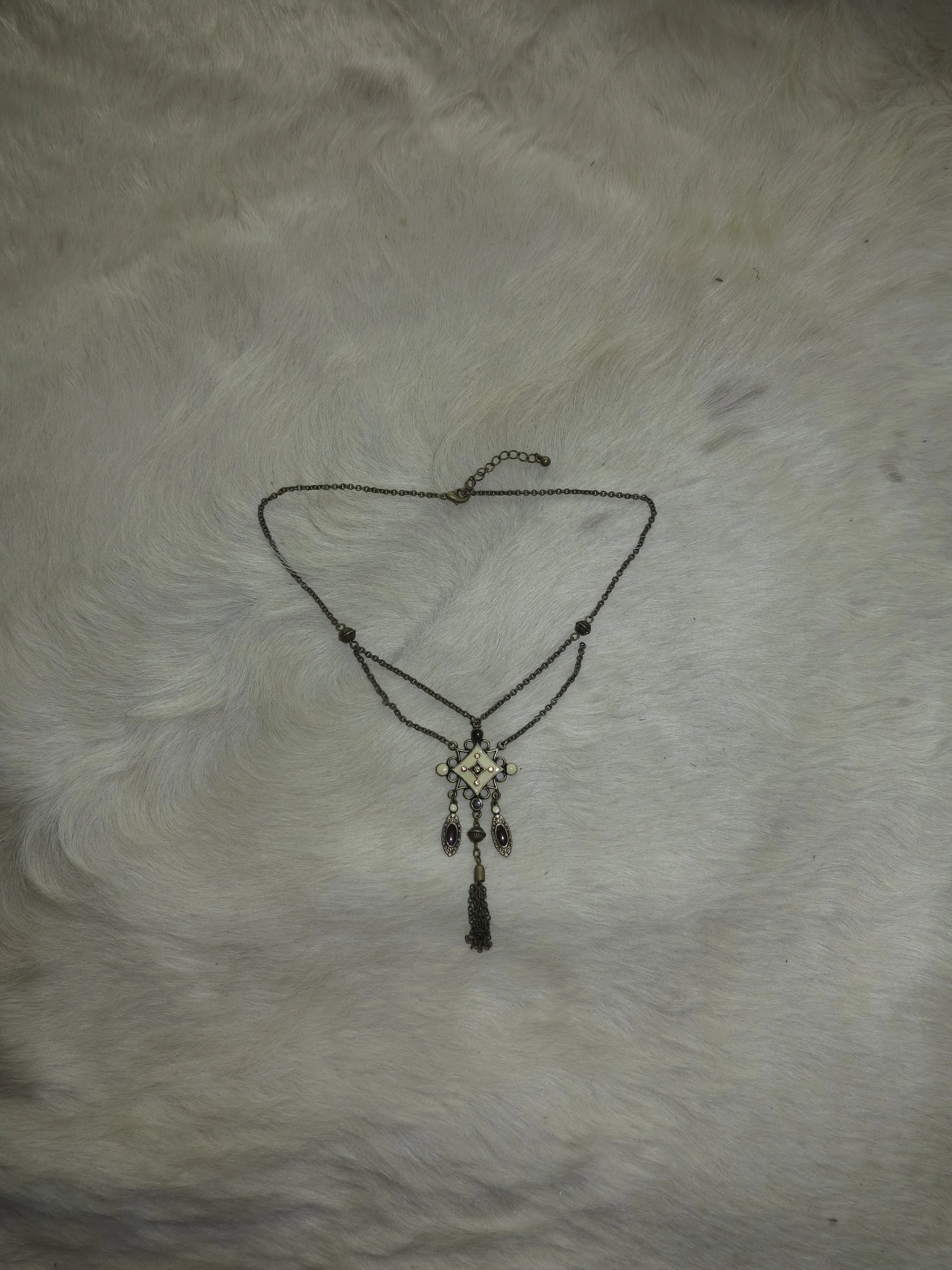 The Quadra Tassel Double Chain Necklace is a grounded vintage piece crafted on a brass chain featuring a beautiful cream pendant with intricate details, attached to draped double brass chains leading to an adjustable clasp.