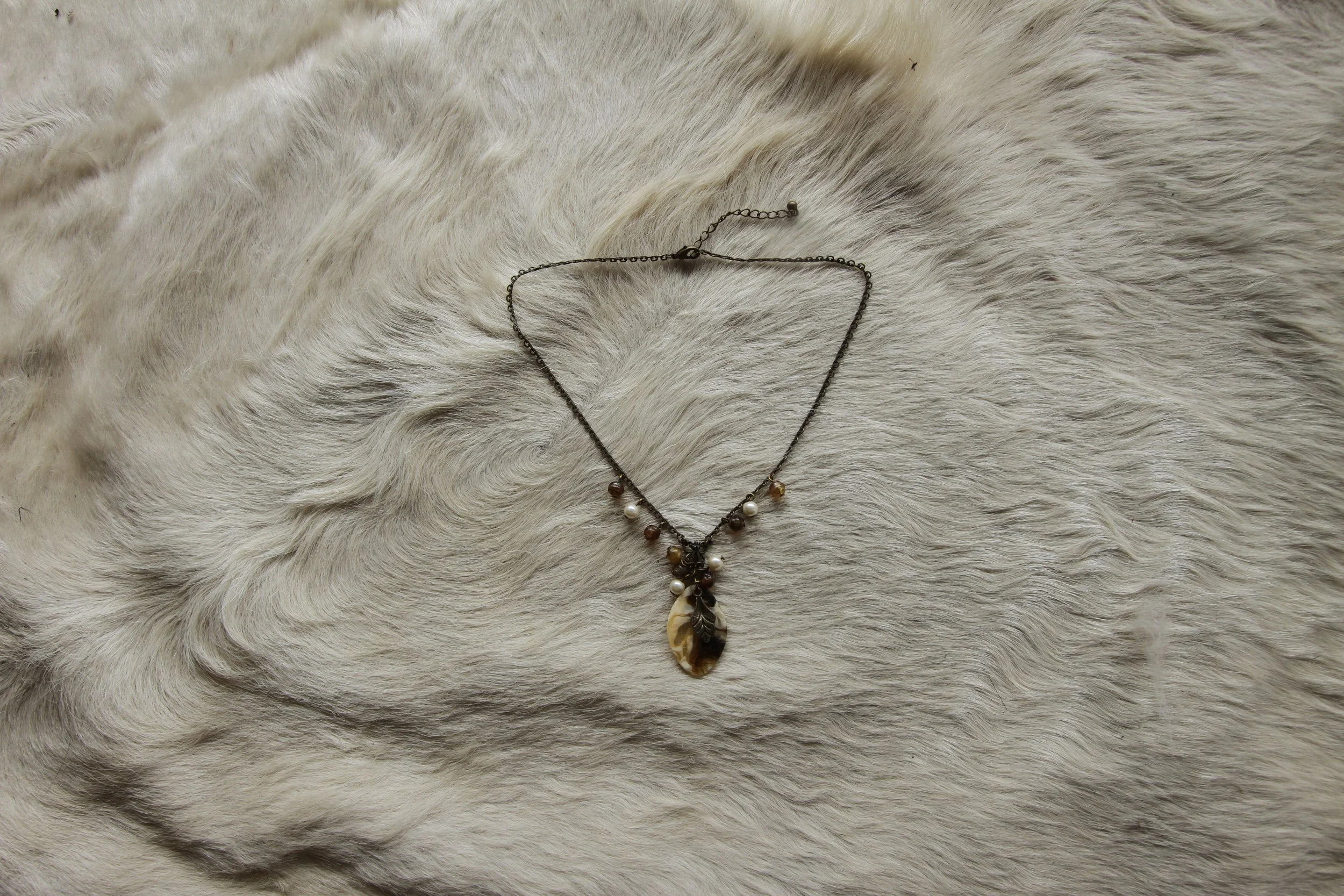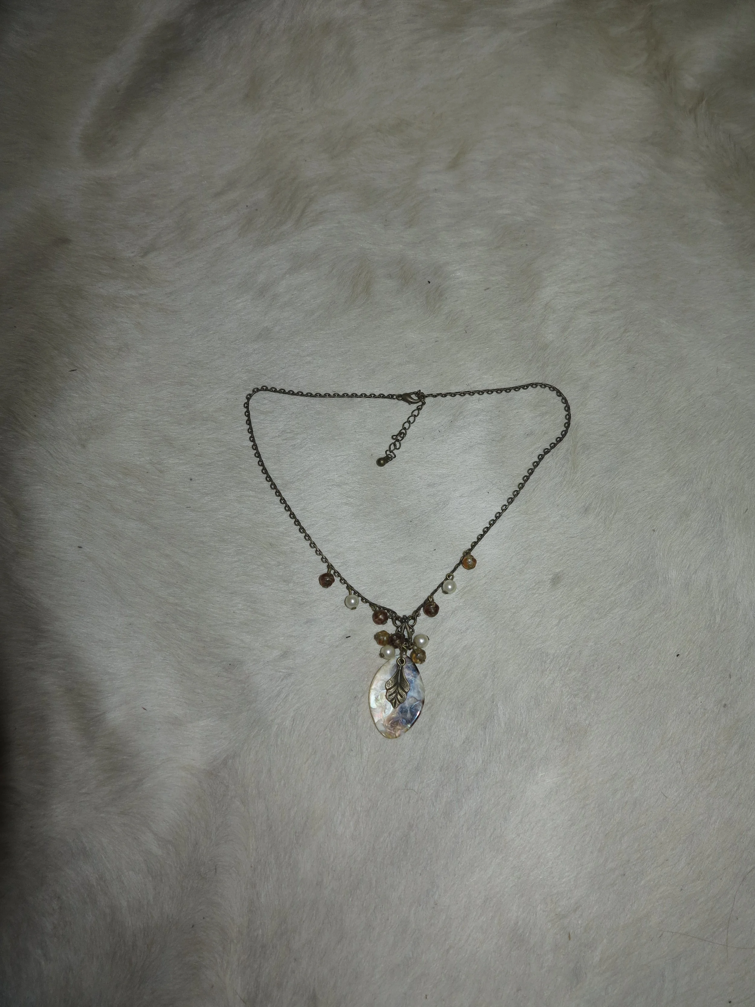The Root Bead Chain Necklace is a grounded vintage piece crafted on a brass chain with beaded detailing. Warm amber and pearl beads with a single leaf pendant dropped at the centre of an oval pearl like shell pendant.